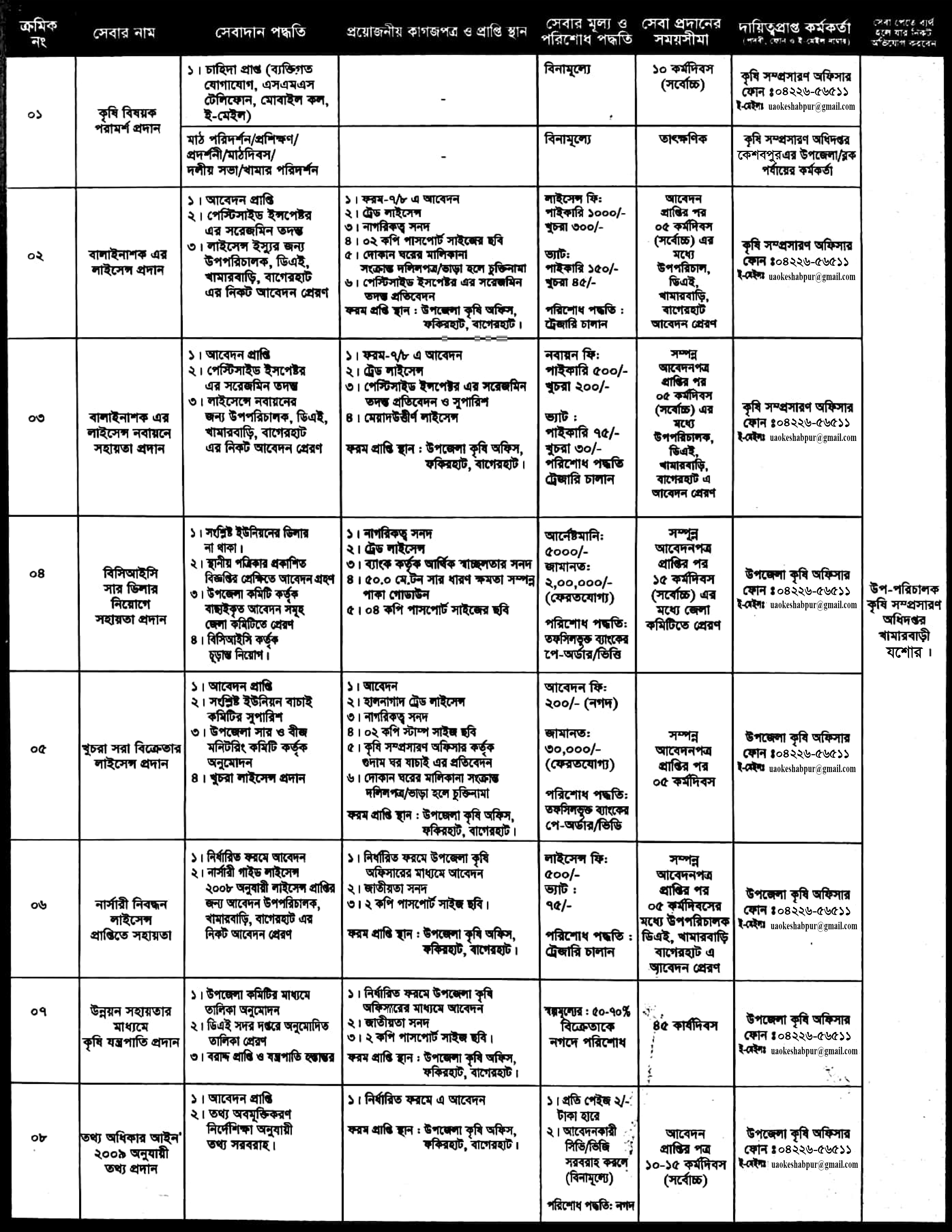 | কৃষি ঋণ প্রাপ্তিতে সহায়তা প্রদান | ১| উপজেলা কৃষি কর্মকর্তা ২| অতিরিক্ত কৃষি কর্মকর্তা ৩। কৃষি সম্প্রসারণ কর্মকর্তা ৪। সহকারী কৃষি সম্প্রসারণ কর্মকর্তা ৫।SAAO |